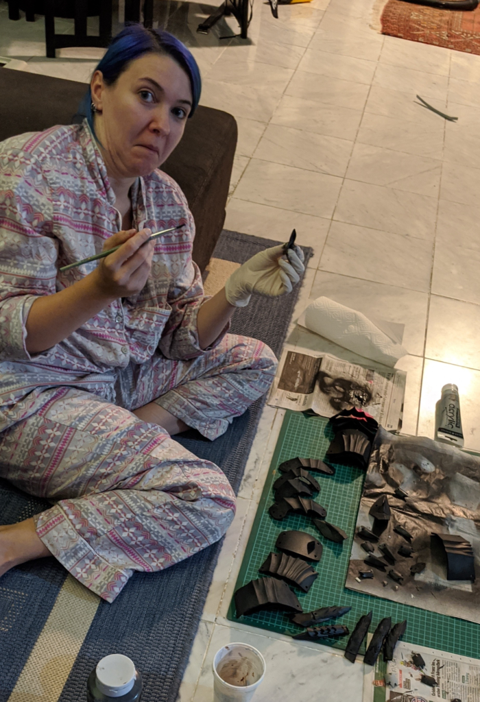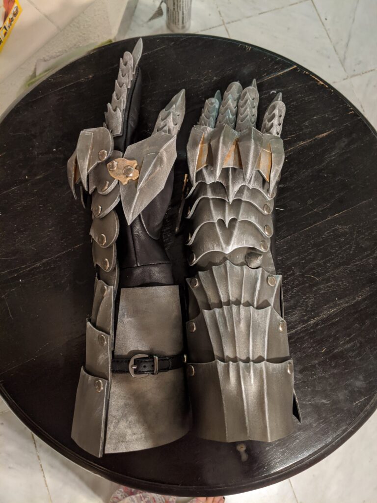 Elenya Frost and Vincent from The Blackwaters did the most work on this. Elenya Frost had everything planned, figured out the patterns, chose the fabrics and Vincent was kind enough to laser cut the EVA foam for all of our gauntlets.