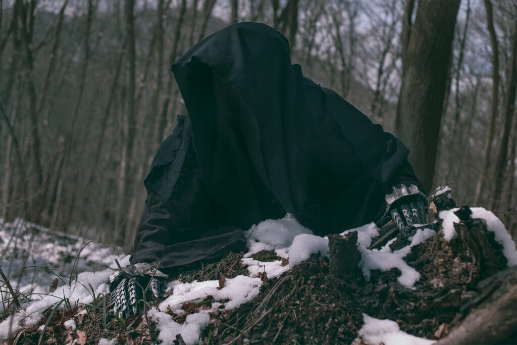 To recreate the impression of hollow robes without a visible person inside we had to extent the hoods a bit so our faces woul be hidden deeper in to the fabric. This was accomplished by modifying baseball caps with foam and then put the fabric over this. An additional piece of black fabric glued to the front edge of the caps, so directly in front of our faces, hides us sufficiently and the shadow of the hood does the rest.
